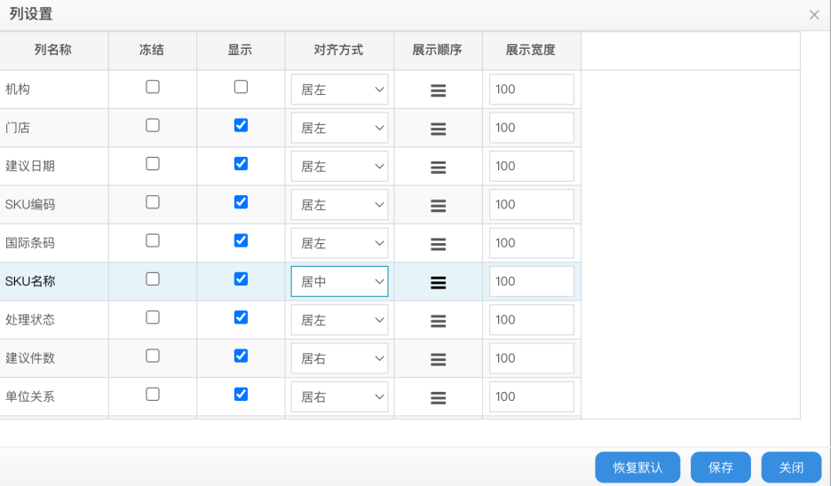 下图为列设置弹窗参考形态:包含列名称、冻结、显示、对齐方式、展示顺序、展示宽度、恢复默认、保存、关闭等能力。