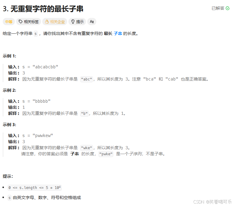 题目:无重复字符的最长子串 点击跳转