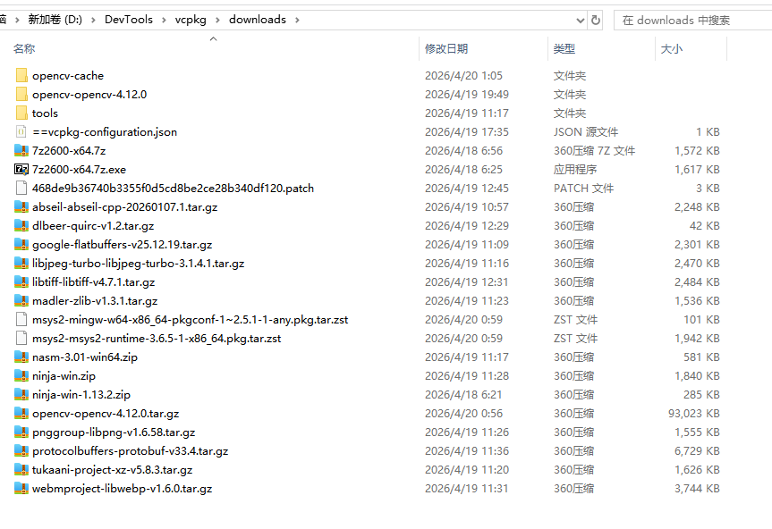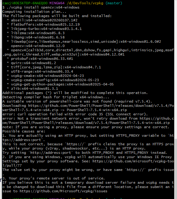 之后执行.\vcpkg install opencv:x64-windows安装opencv,发现根本不行,需要安装很多依赖库,靠国内的网完全搞不定,一直报错,然后我根据报错信息,把十几个依赖库一次下载下来