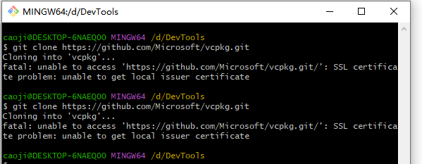 我采用了第一种,git -c http.sslVerify=false clone https://github.com/Microsoft/vcpkg.git结果发现速度太慢,使用了各种方式解决,凌晨5点醒来再次尝试,速度很快,成功了.暂时定位为国内白天网速太慢,先往下接着弄.