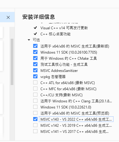 MSVC v143 - VS 2022 C++ x64/x86 生成工具(这是编译器核心)。