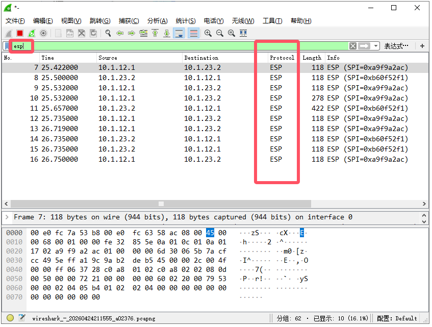 在 Wireshark 的显示过滤器栏输入 esp,回车。