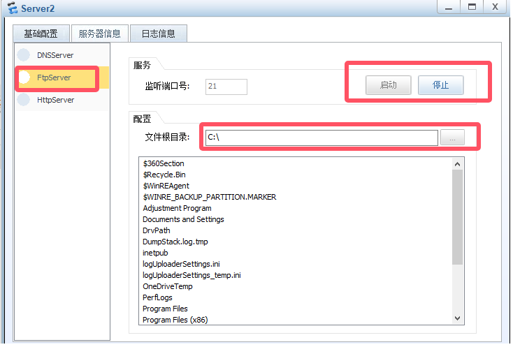 双击打开sever2-ftpsever-根目录选择c盘-启动监听端口: