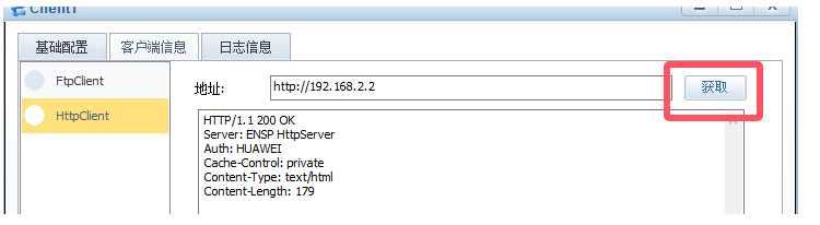 双击打开Client1-客户端信息-HttpClient-输入server2的IP地址http://192.168.2.2,成功获取文件