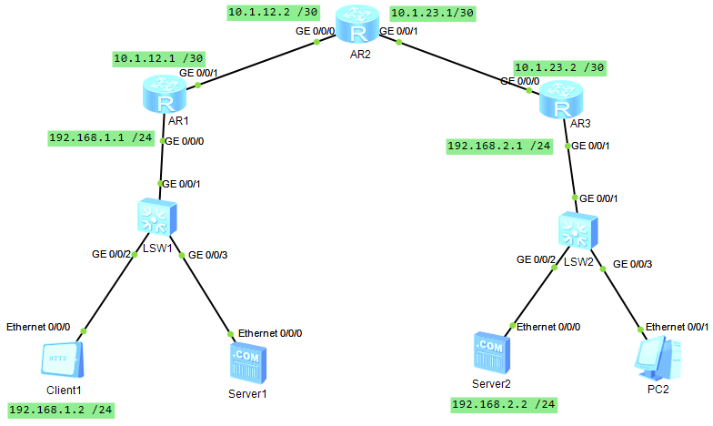 | AR2 | GE0/0/0 | 10.1.12.2/30 | - | 公网 |