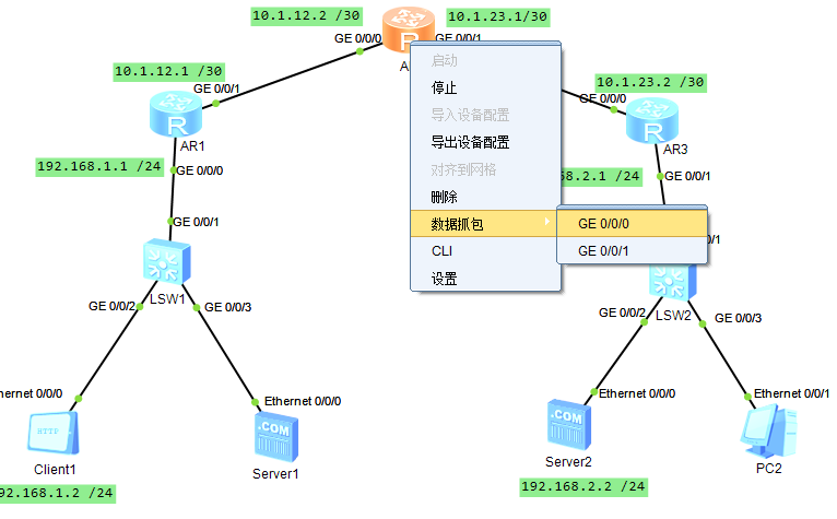 ①点击AR2,右键-数据抓包-0/0/0端口或者 0/0/1端口: