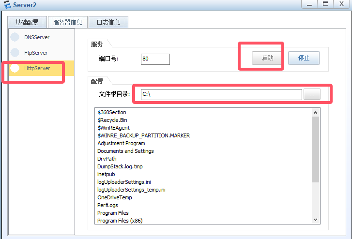 双击打开sever2设备-服务器信息-HttpSever-选择文件根目录为C盘-点击启动,如下图所示: