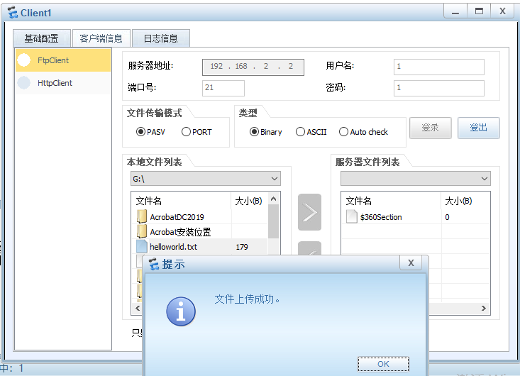 双击打开client1-ftpclient-服务器地址192.168.2.2-点击登录-将G盘刚刚创建的文件helloworld.txt-点击大于号: