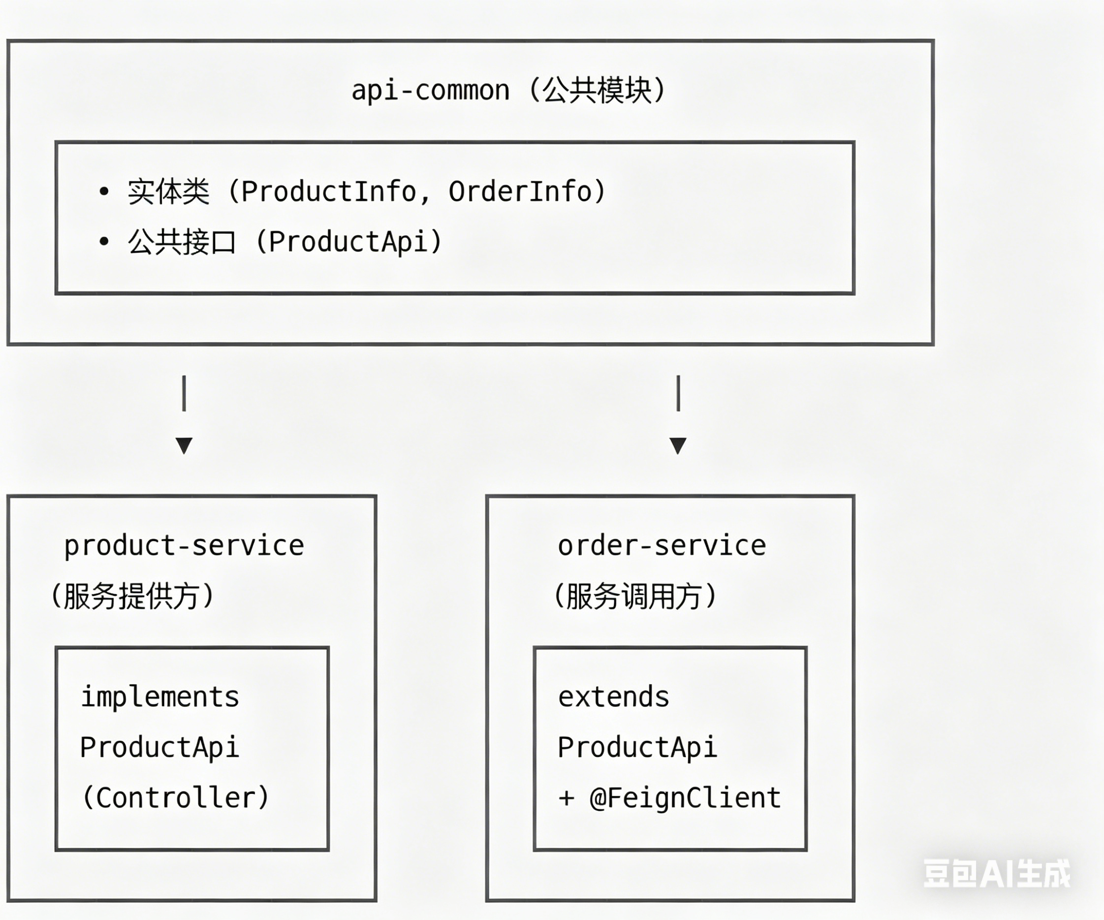 textspring-cloud-blog/ │ ├── common/ # 公共模块 │ ├── core/ # 核心公共模块 │ │ ├── src/ │ │ │ ├── main/ │ │ │ │ ├── java/org/example/ │ │ │ │ │ ├── api/ │ │ │ │ │ │ └── ProductApi.java # Feign客户端 │ │ │ │ │ └── core/ │ │ │ │ │ ├── OrderInfo.java # 订单信息实体 │ │ │ │ │ └── ProductInfo.java # 产品信息实体 │ ├── modules/ # 业务模块 │ ├── order-service/ # 订单服务 │ │ ├── src/ │ │ │ ├── main/ │ │ │ │ ├── java/org/example/orderservice/ │ │ │ │ │ ├── feign/ │ │ │ │ │ │ └── ProductFeignClient.java # 继承 ProductApi + @FeignClient │ │ │ ├── product-service/ # 产品服务 │ │ ├── src/ │ │ │ ├── main/ │ │ │ │ ├── java/org/example/productservice/ │ │ │ │ │ ├── controller/ │ │ │ │ │ │ └── ProductController.java # 实现ProductApi