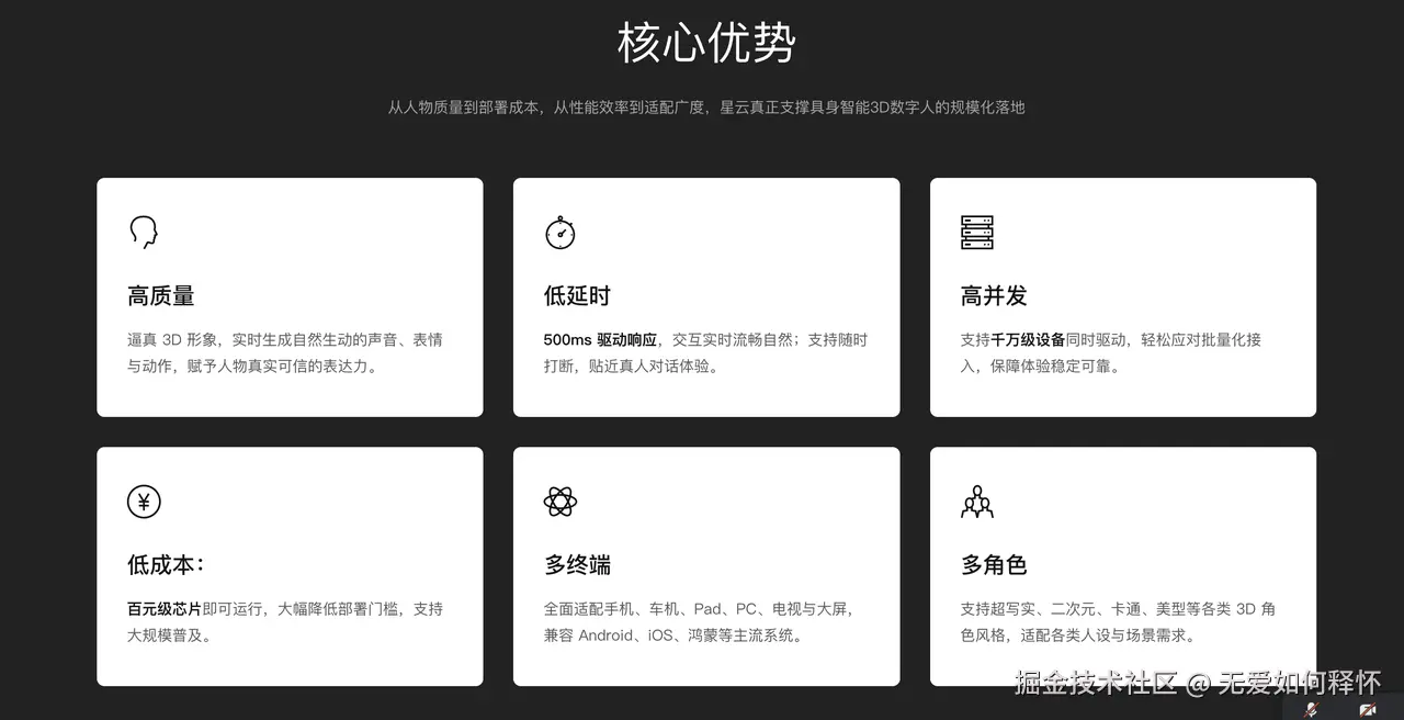 - 核心技术:底层逻辑的"硬核"重构 作为开发者,我最看重的是它的工程美学。单纯堆叠 LLM 和 TTS 解决不了卡顿,魔珐星云的 Widget 代理机制 让我能深度接管业务渲染,而智能打断算法则赋予了 AI 像真人一样的沟通节奏------能听、能说、能随时反应。