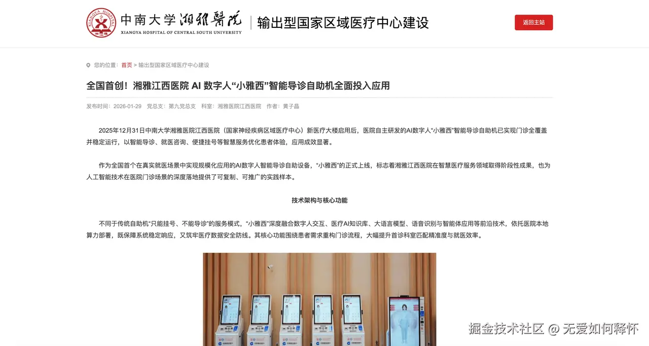 - 流程重构与增效:通过重构门诊流程,"小雅西"大幅提升了首诊科室匹配的精准度与就医效率,实现了智慧医疗服务的全覆盖稳定运行。