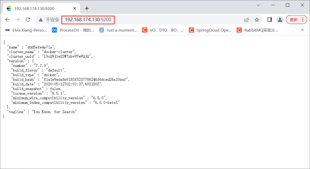Windows浏览器上访问虚拟机9200端口,得到以下返回信息表示安装成功