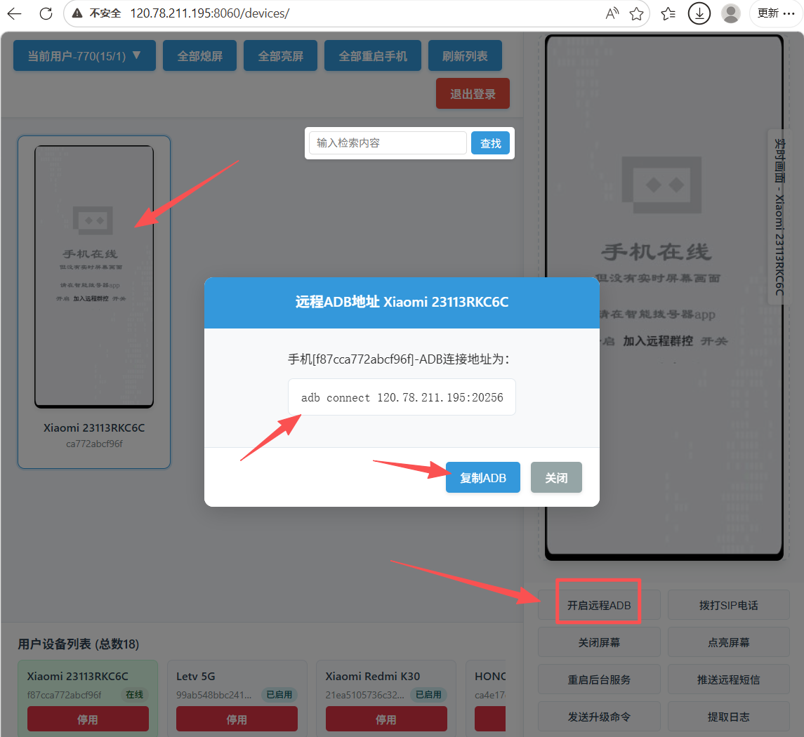 用户从在线设备列表中的选中某一个手机设备,在右侧的控制按钮区域中点击【开启远程ADB】,即可对远程的目标手机设备本地的5555端口重定向到阿里云服务器120.78.211.195:20256端口。用户可以在电脑上直接使用【复制ADB】按钮,将