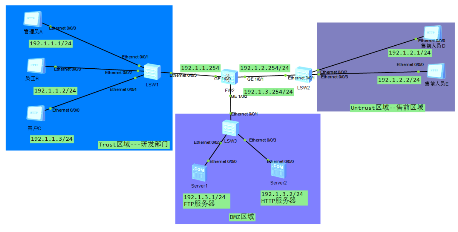 | Untrust | GE1/0/1 | 192.1.2.254/24 | 192.1.2.0/24 | 售前部门外网,包含员工 D、E |