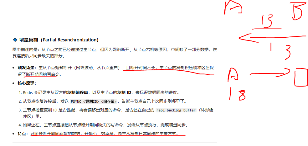 - 只有网络 / 节点短暂故障恢复后,会根据情况触发增量复制;如果故障时间太长,缓冲区里的命令被覆盖了,就会降级为全量复制。