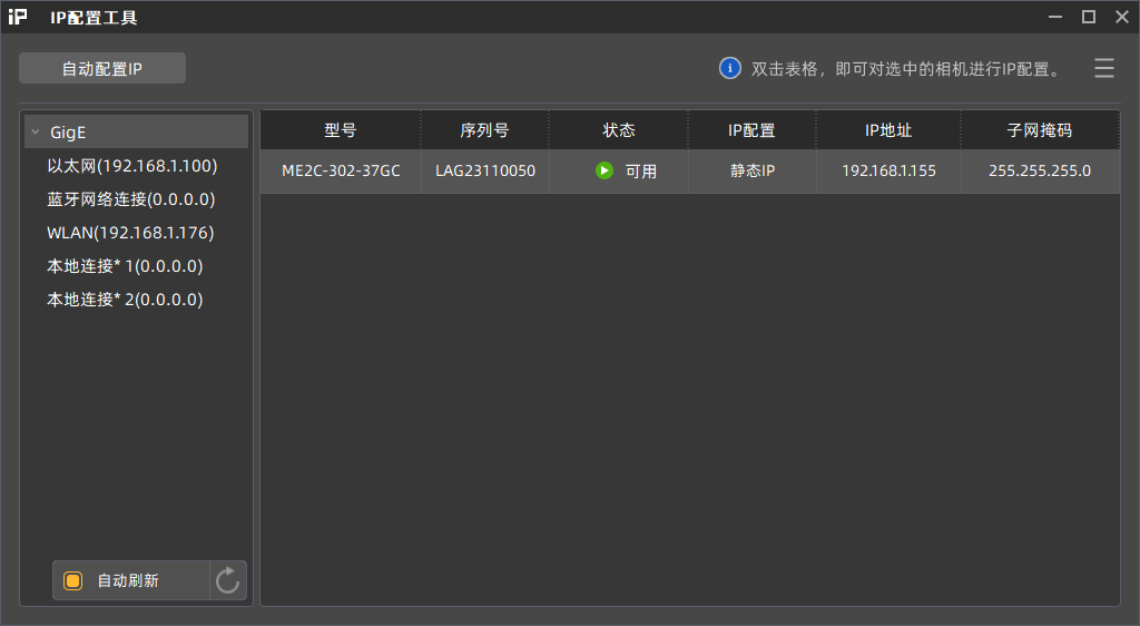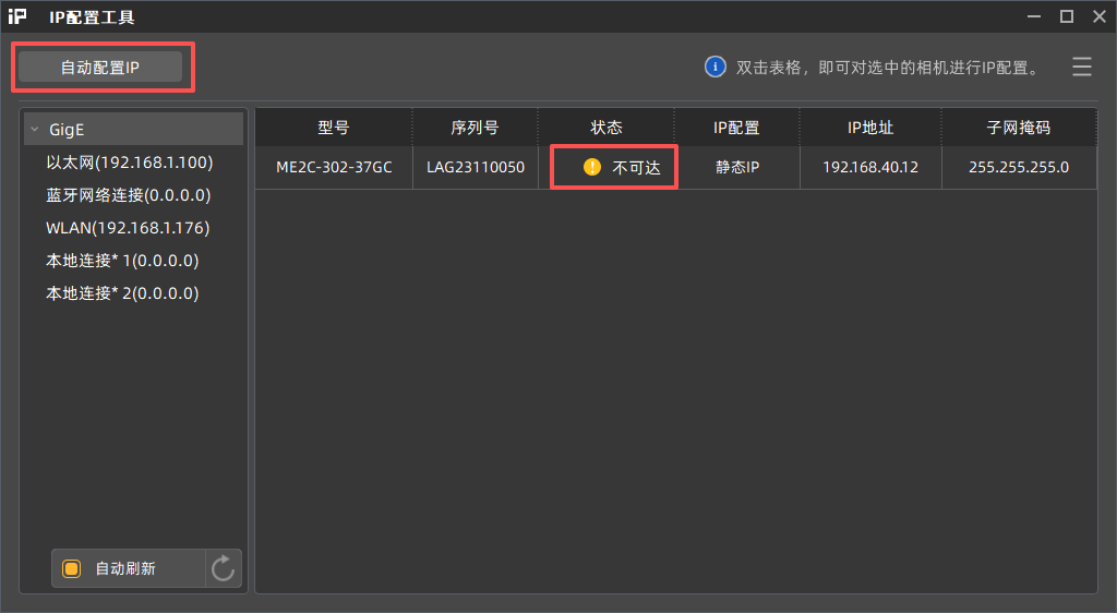 自动配置IP(快速配置所有):点击"自动配置 IP"按钮,可以将所有显示"不可达"的相机的IP 都改成和PC 网口相同网段的有效IP。