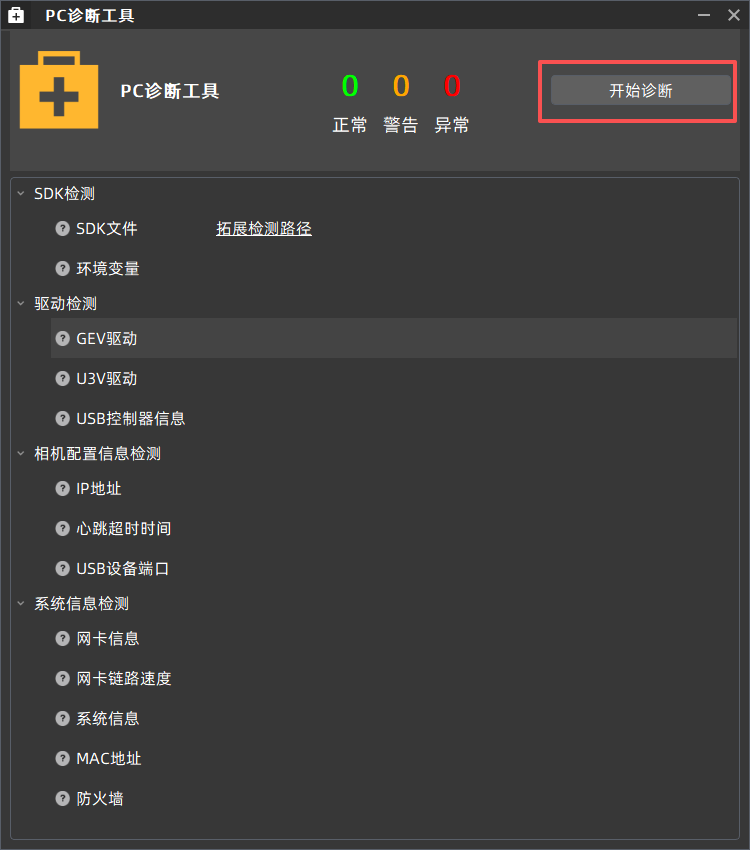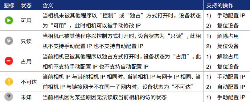 - 黄色感叹号标识:相机IP与电脑网卡IP不在同一网段(默认情况下均为此状态);