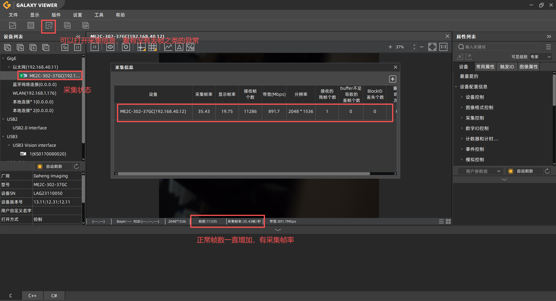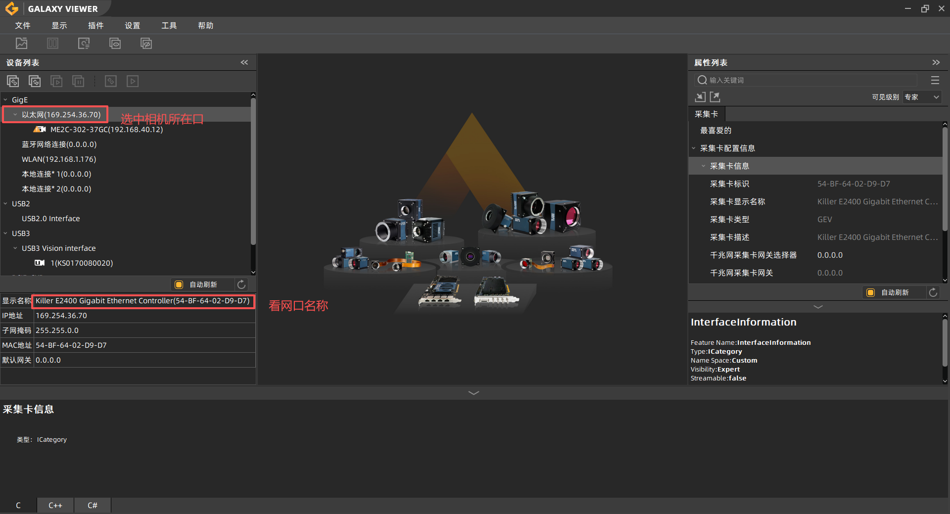 IP配置完成后,通过Galaxy Viewer工具验证相机是否能正常连接、出图,确保配置生效。