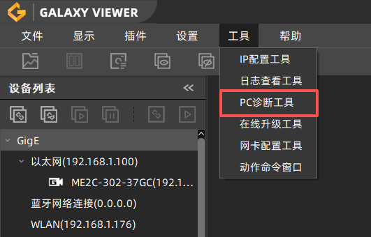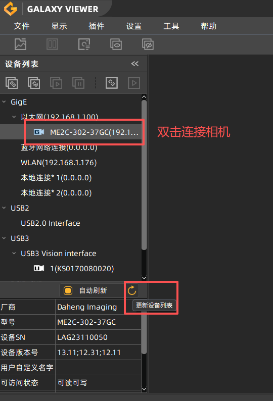 在Galaxy Viewer界面中,点击上方菜单栏的"设备",选择"更新设备列表",工具会自动搜索已连接的相机。