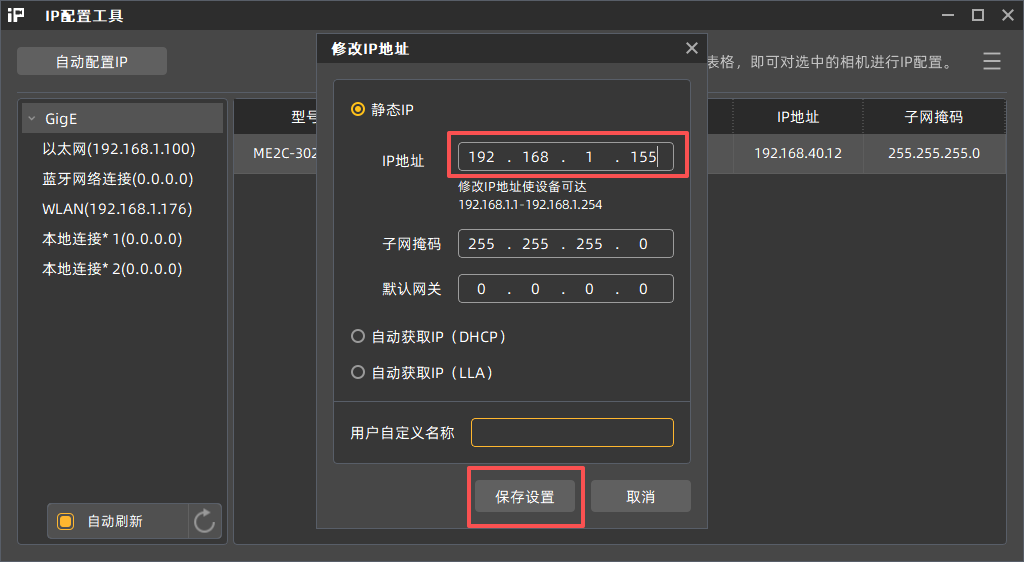 填写完成后,点击"保存设置",设置完相机就会重新出现在IP配置工具里,此时相机IP已永久固定,断电重启后不会恢复默认值。