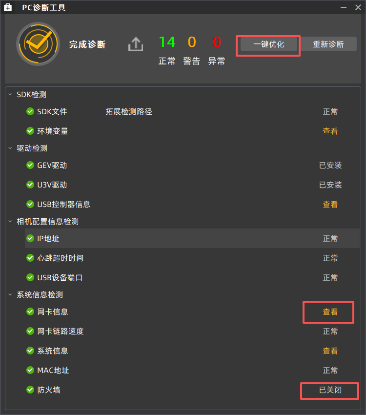 - 可以看网卡信息那些有没有问题,点击【一键优化】