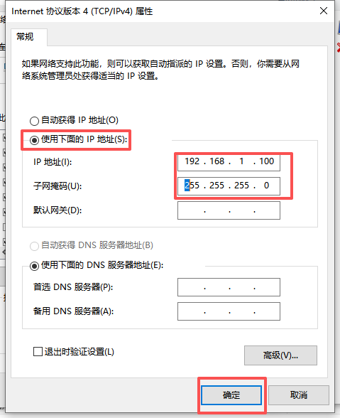 IP地址:192.168.1.100(可在192.168.1.1~192.168.1.254之间任选,需避免与相机IP重复);