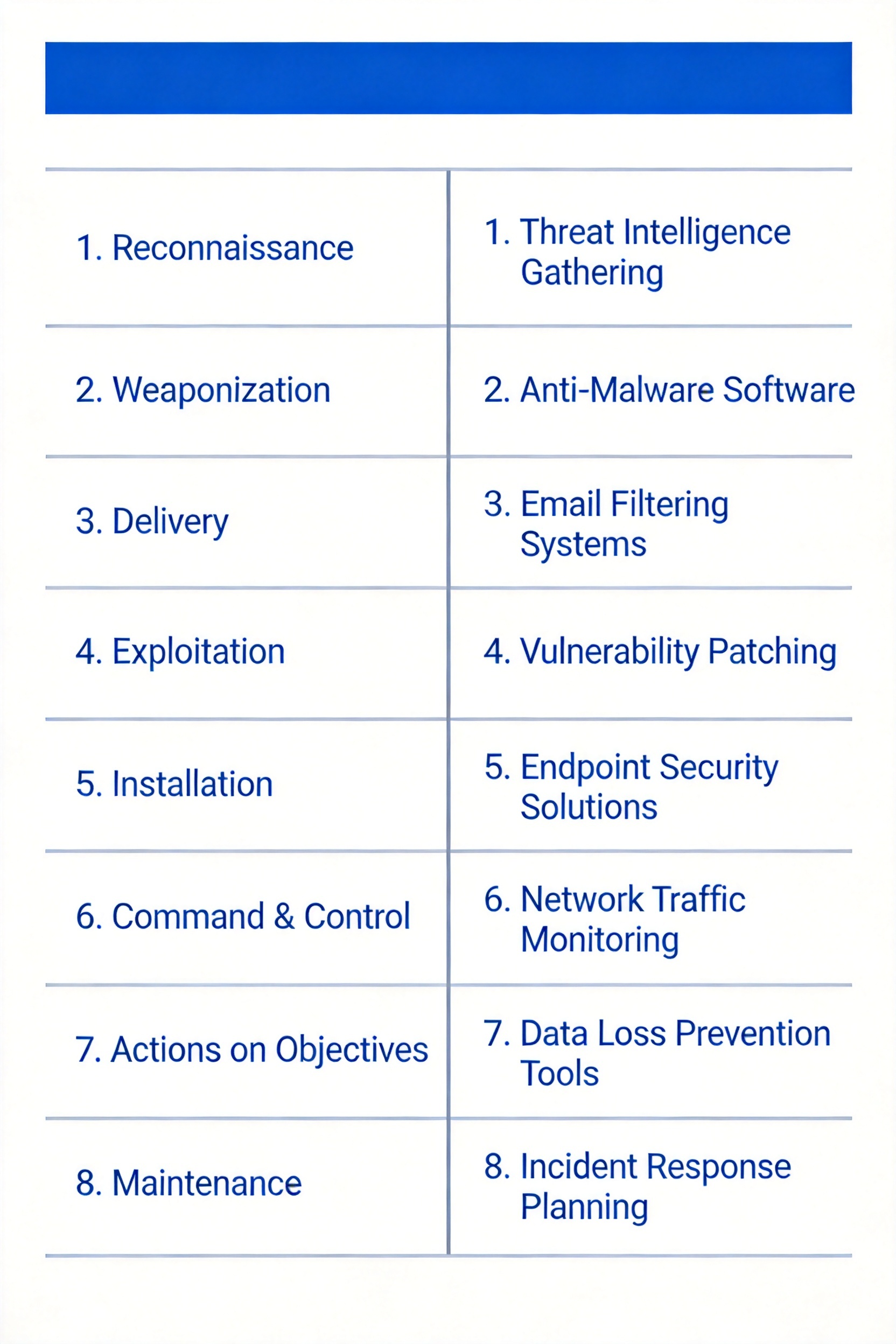 网络攻击生命周期与防御技术对应图,左侧为 8 个攻击阶段,右侧为每个阶段对应的防御措施