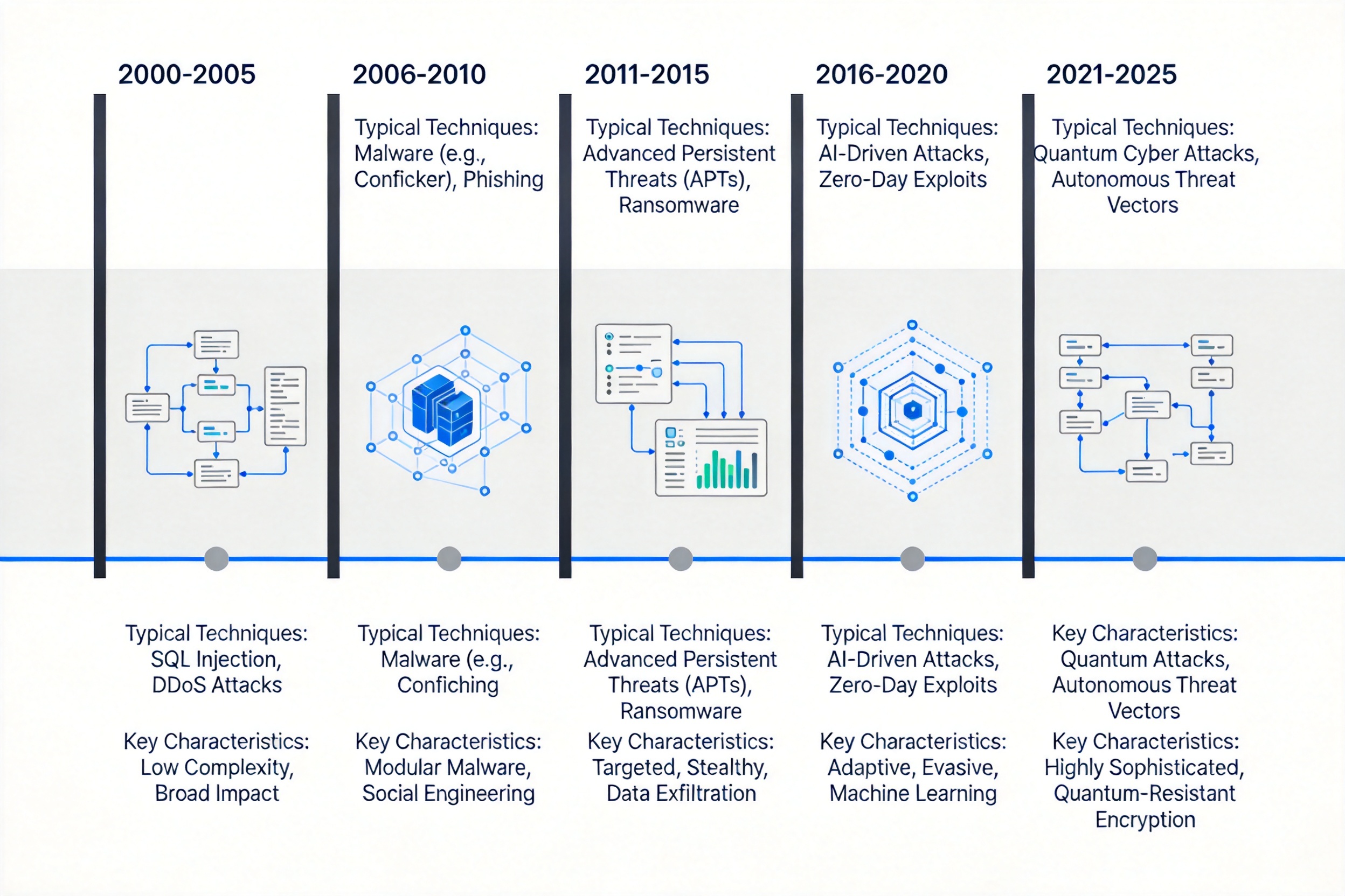 网络攻击技术演进路线图,时间跨度从 2000 年到 2025 年,标注每个阶段的典型攻击技术与特征