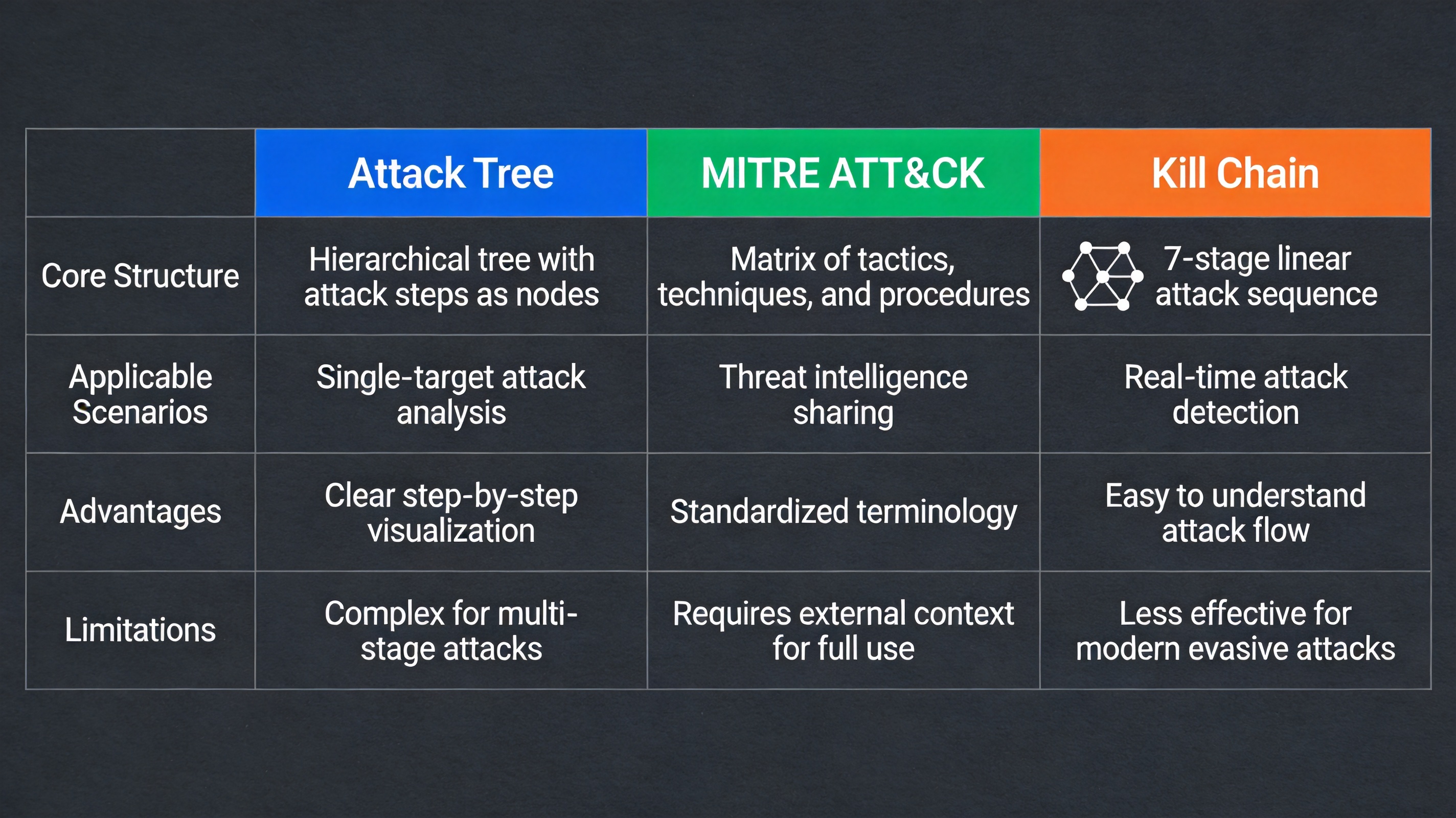 三类攻击模型对比图,包含核心结构、适用场景、优点、局限性四个对比维度