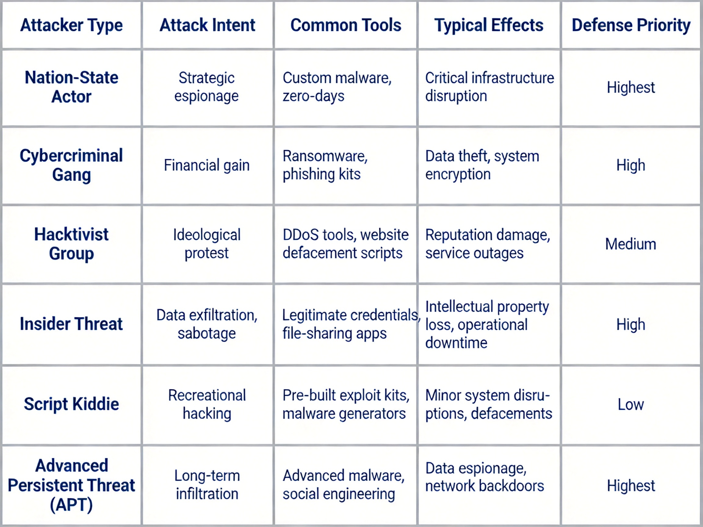 六类攻击者特征对比表,横向维度为攻击者类型、攻击意图、常用工具、典型效果、防御优先级