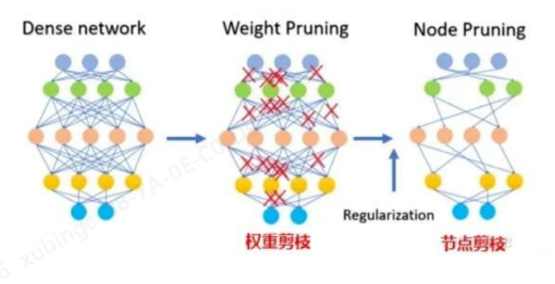 (配图:网络剪枝流程图Dense network 稠密网络 → Weight Pruning 权重剪枝 → Node Pruning 节点剪枝)