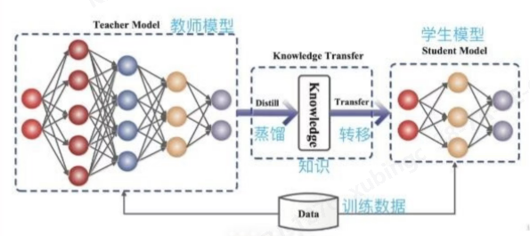 (配图:知识蒸馏流程图Teacher Model 教师模型 → 知识蒸馏、知识转移 → Student Model 学生模型,下方共用训练数据 Data)