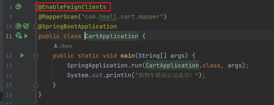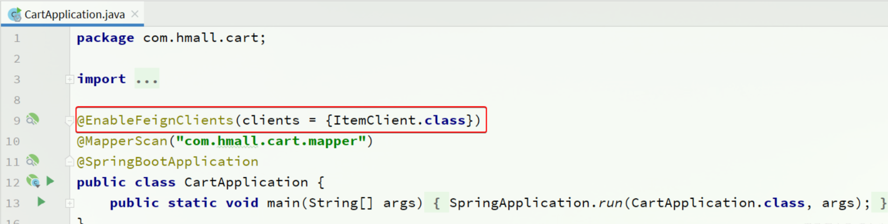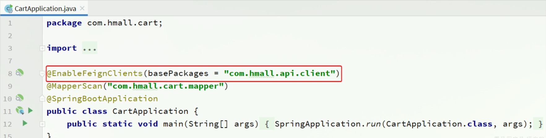 ItemClient定义到了com.hmall.api.client包下,而cart-service的启动类定义在com.hmall.cart包下,扫描不到ItemClient,所以报错了,解决方法,在cart-service的启动类上添加声明即可,两种方式: