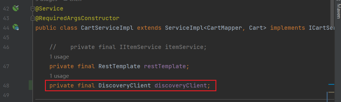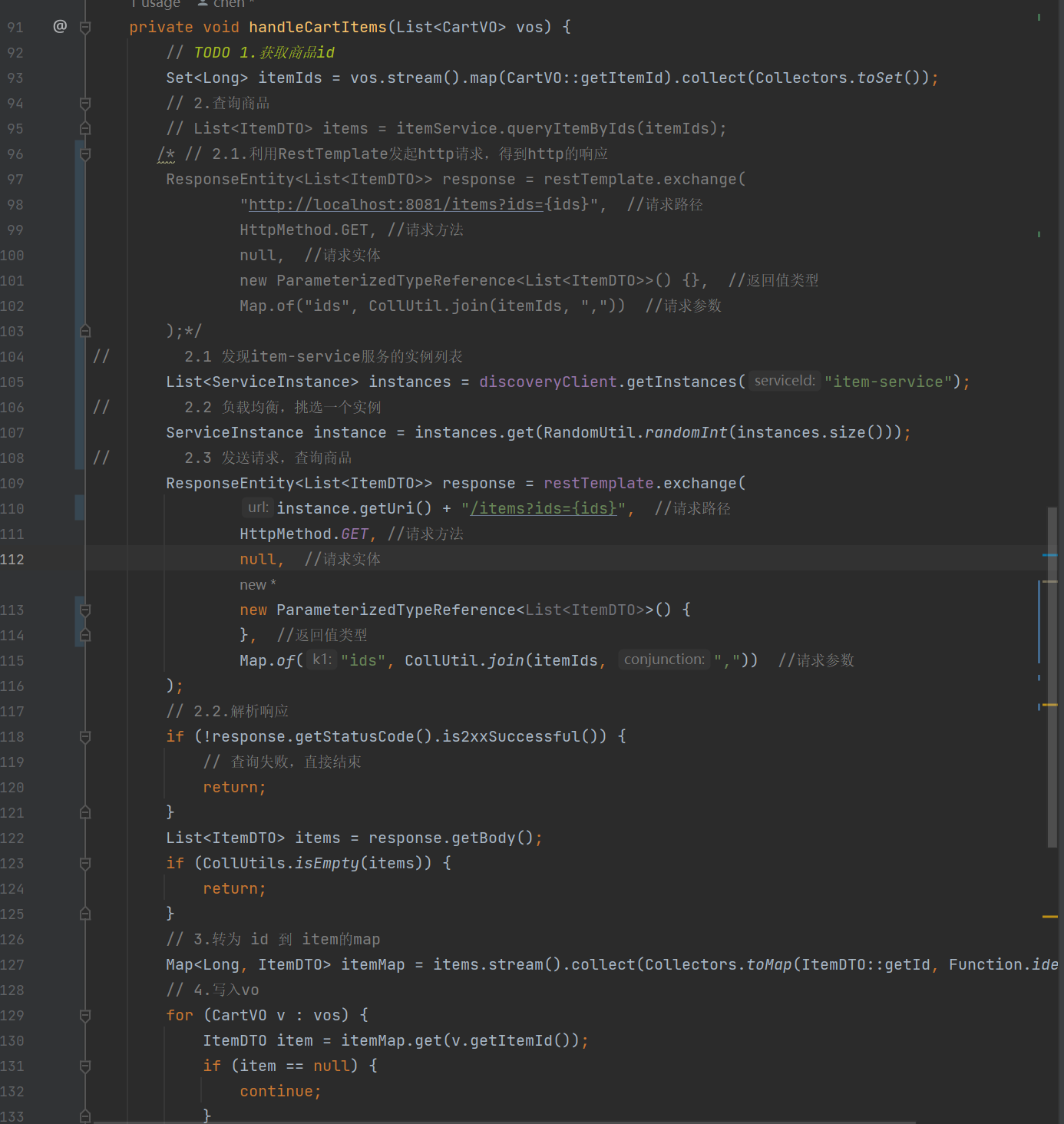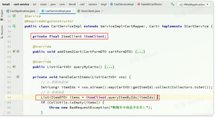 在cart-service的com.hmall.cart.service.impl.CartServiceImpl中的代码,直接调用ItemClient的方法: