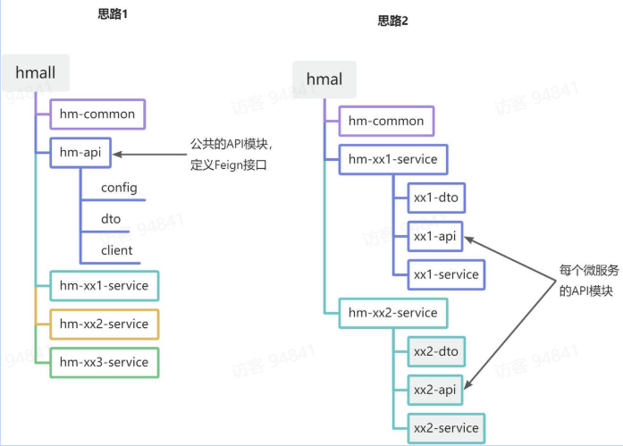 思路2: 每个微服务自己抽取一个module,抽取相对麻烦,工程结构相对更复杂,但服务之间耦合度降低;