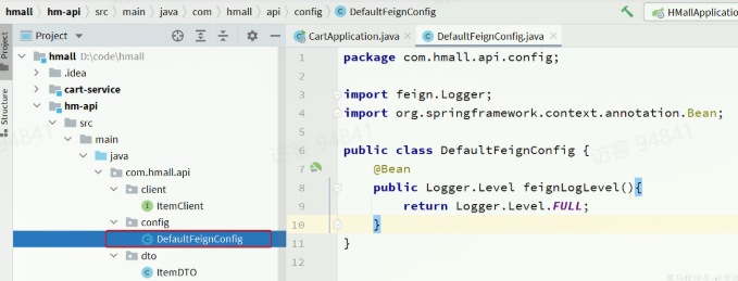 在hm-api模块下新建一个配置类,定义Feign的日志级别: