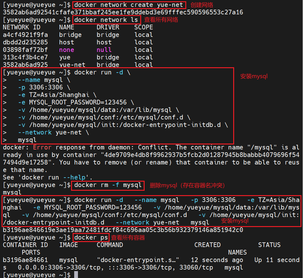cd /root和docker compose down命令,删除同目录下,可能存在相同的项目; - 安装mysql