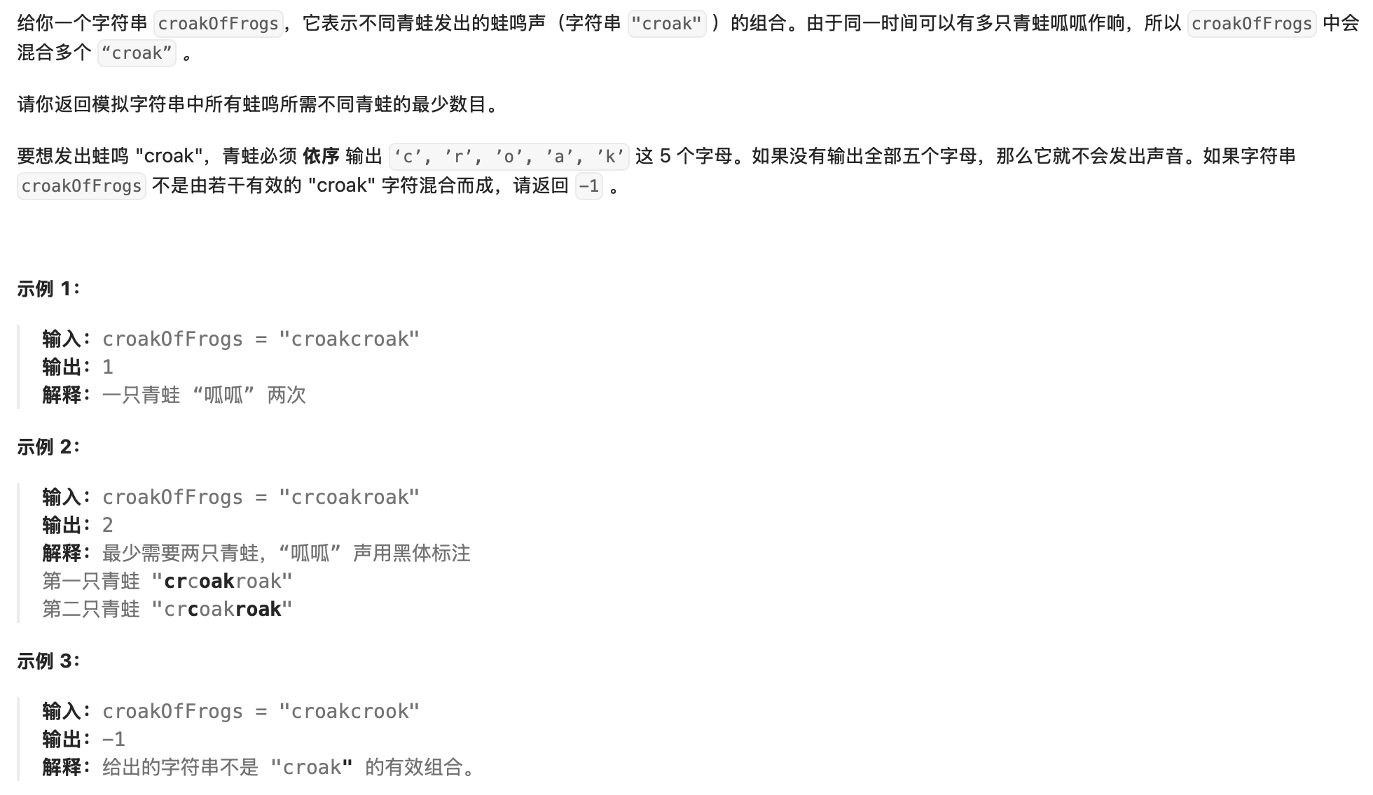 提示:1 <= croakOfFrogs.length <= 105;字符串中的字符只有 'c', 'r', 'o', 'a' 或者 'k'