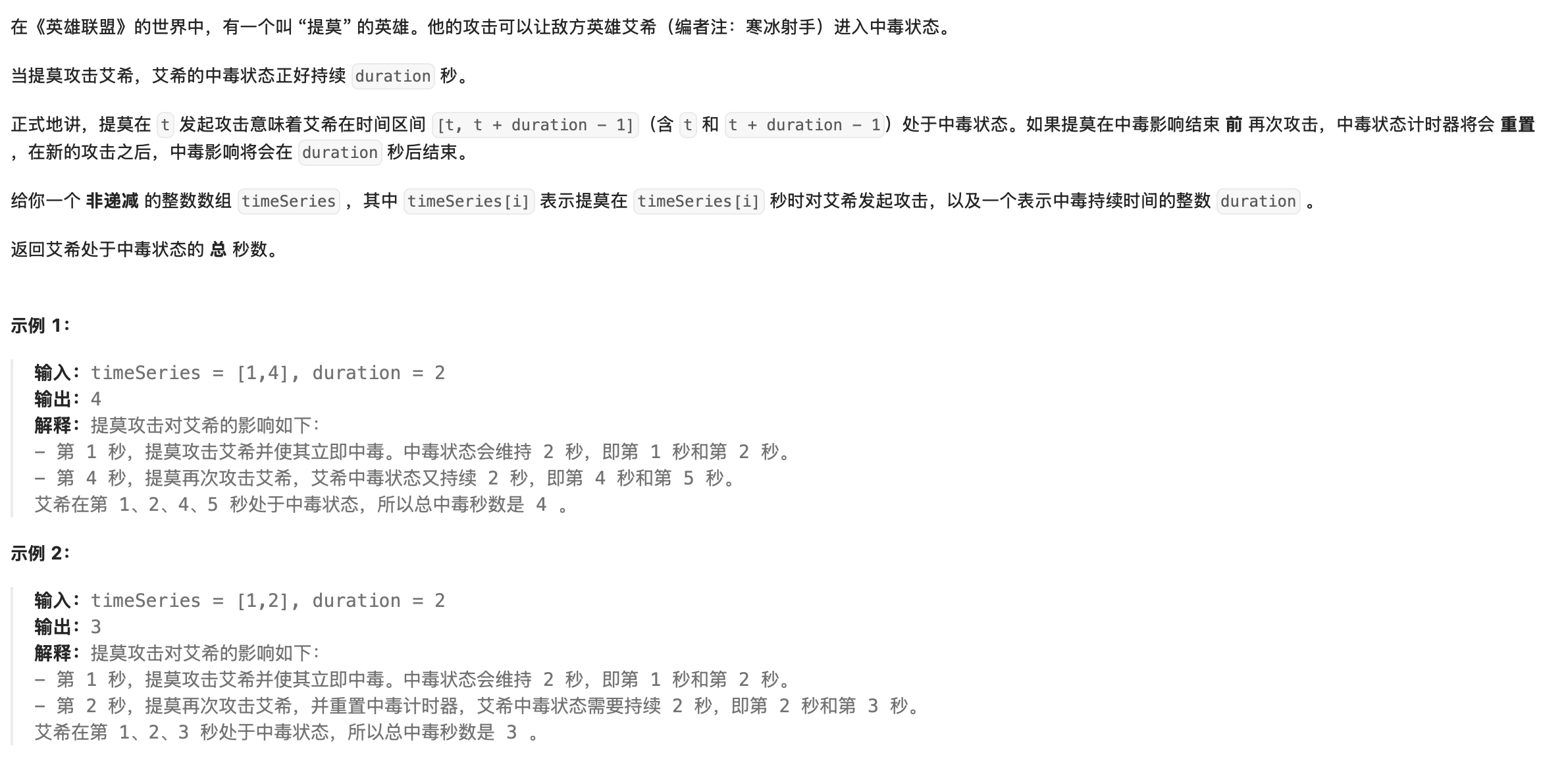 重叠计算的本质:中毒时间的重叠部分只会被计算一次,所以两次攻击的有效中毒时间就是 min(tmp, duration),代码可以简化为:ret += min(timeSeries[i] - timeSeries[i-1], duration);