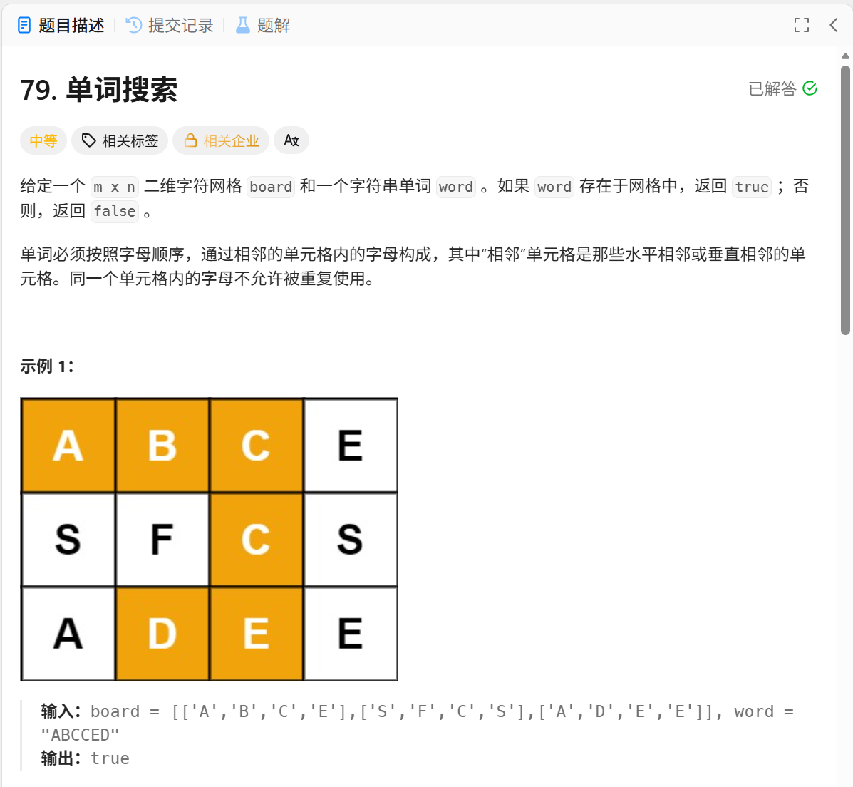 遍历所有格子的行和列,内部通过一个递归函数来查找,满足if条件就是查找到了相应的单词,返回true,否则返回false。