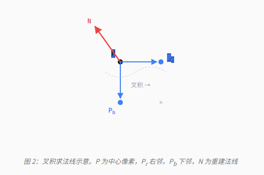 取当前像素与右邻、下邻的世界坐标差,叉积归一化: