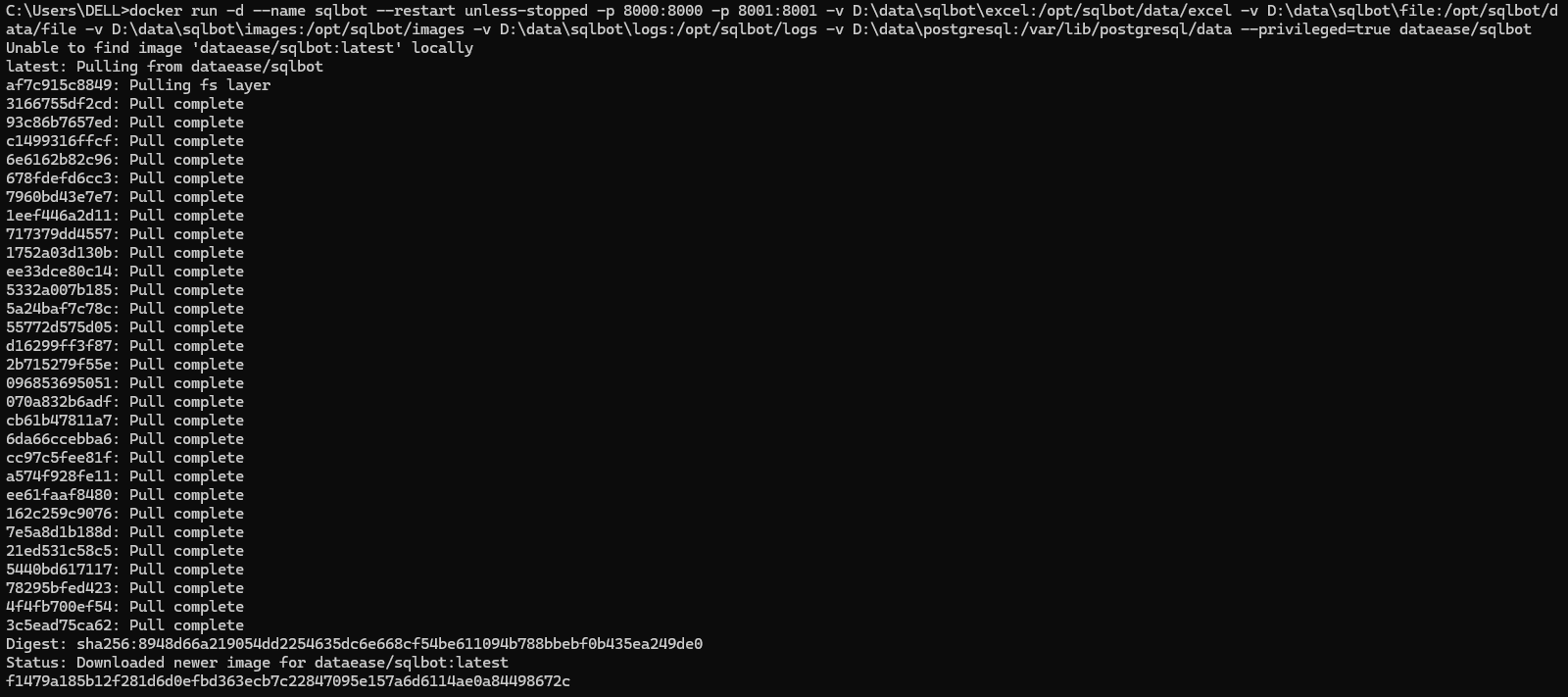 docker run -d --name sqlbot --restart unless-stopped -p 8000:8000 -p 8001:8001 -v D:\data\sqlbot\excel:/opt/sqlbot/data/excel -v D:\data\sqlbot\file:/opt/sqlbot/data/file -v D:\data\sqlbot\images:/opt/sqlbot/images -v D:\data\sqlbot\logs:/opt/sqlbot/logs -v D:\data\postgresql:/var/lib/postgresql/data --privileged=true dataease/sqlbot