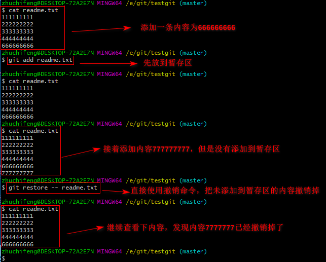 对于第二种情况,我想我们继续做demo来看下,假如现在我对readme.txt添加一行 内容为6666666666666,我git add 增加到暂存区后,接着添加内容7777777,我想通过撤销命令让其回到暂存区后的状态。如下所示: