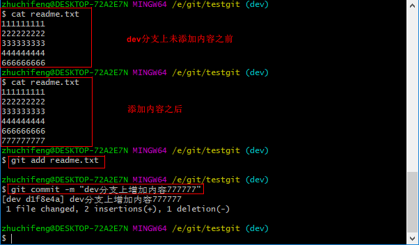 git branch查看分支,会列出所有的分支,当前分支前面会添加一个星号。然后我们在dev分支上继续做demo,比如我们现在在readme.txt再增加一行 7777777777777