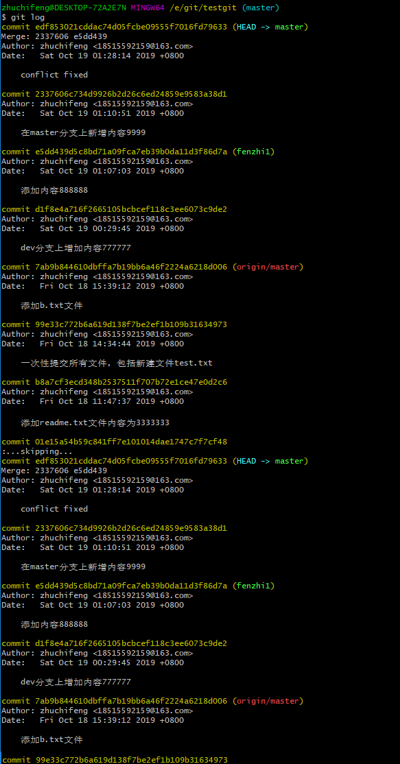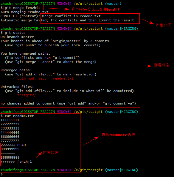 现在我们需要在master分支上来合并fenzhi1,如下操作: