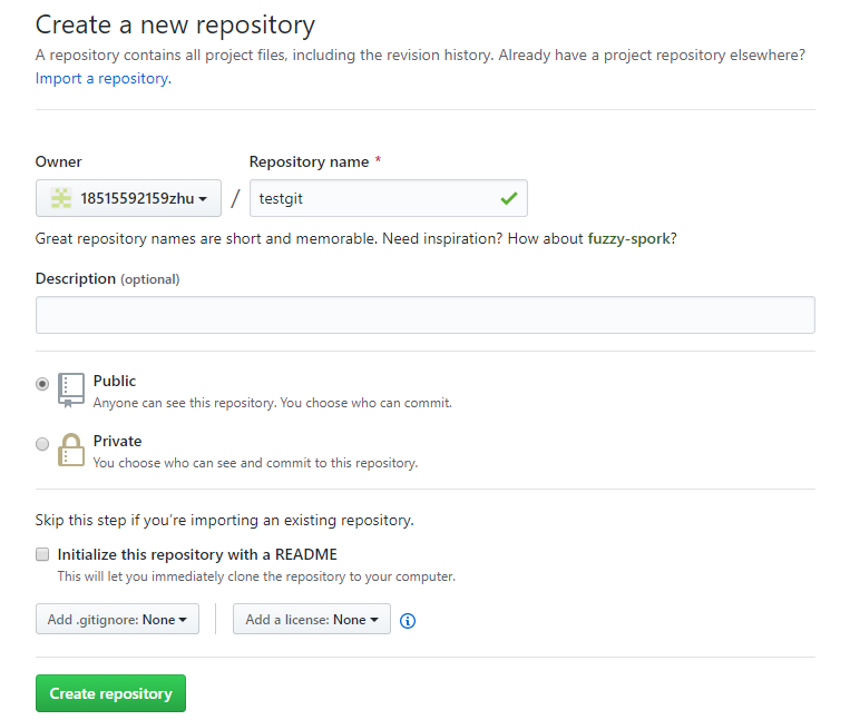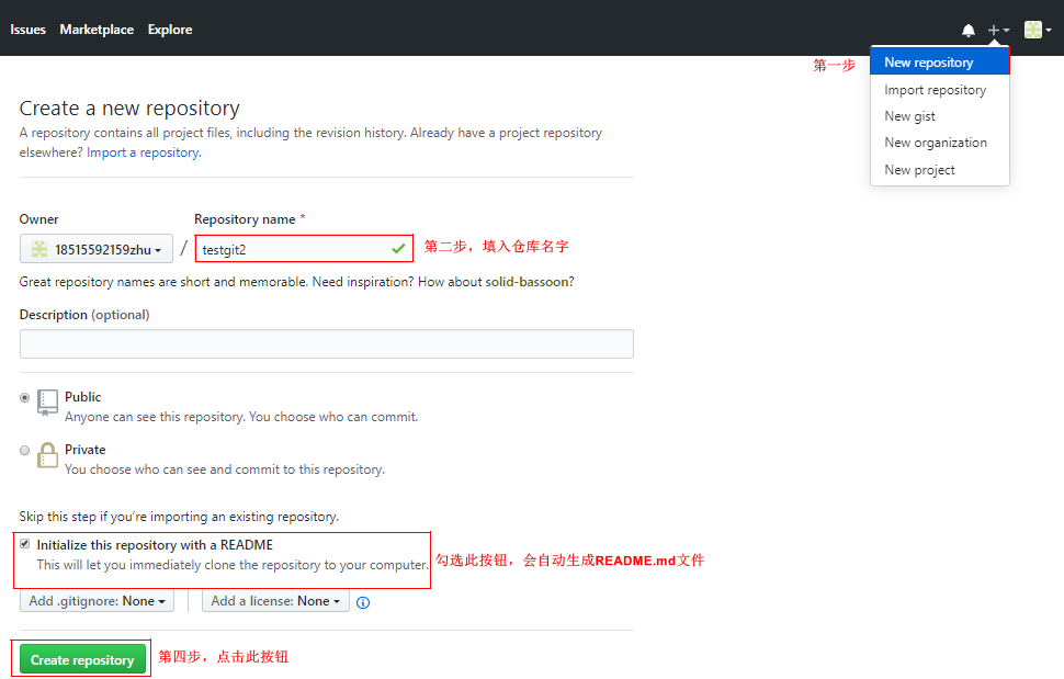 首先,登录github,创建一个新的仓库,名字叫testgit2如下: