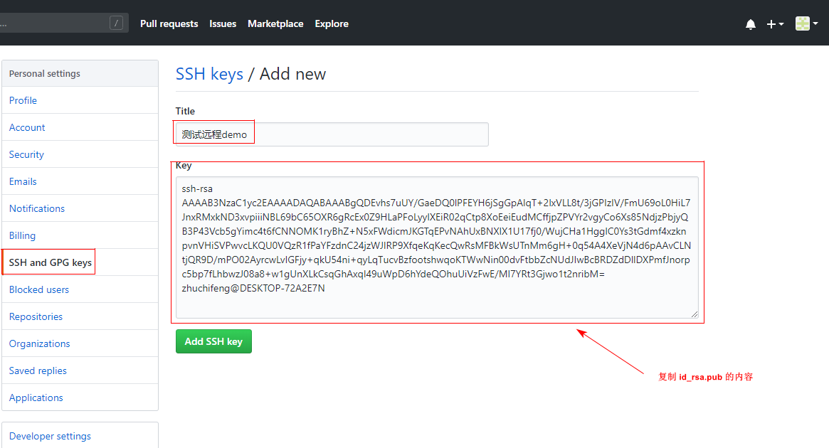 在key部分将id_rsa.pub文件内容添加进去,然后点击"Add SSH key"按钮完成配置。