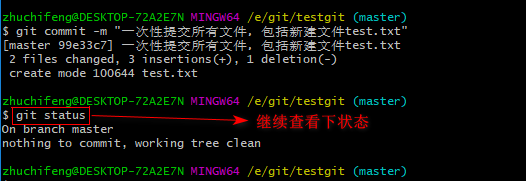 现在我们已经提交了一个readme.txt文件了,我们下面可以通过命令git status来查看是否还有文件未提交,如下: