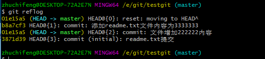 git reset --hard 版本号 ,但是现在的问题假如我已经关掉过一次命令行或者333内容的版本号我并不知道呢?要如何知道增加3333内容的版本号呢?可以通过如下命令即可获取到版本号:git reflog 演示如下: