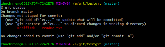 上面的命令告诉我们 readme.txt文件已被修改,但是未被提交的修改。